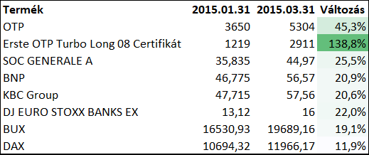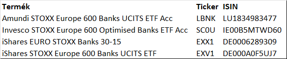 A javasolt befektetés ezért elsősorban OTP vásárlás. Aki ennél is nagyobb kockázatot kíván vállalni, az próbálkozzon meg valamelyik OTP árától függő Erste Turbó Long warrant, például az Erste Bank Turbó Long 108 megvásárlásával. Aki viszont óvatosabb, és diverzifikálni is szeretne, annak az európai bankrendszert követő ETF-eket ajánljuk, amelyeket az alábbi táblázatban sorolunk fel.
