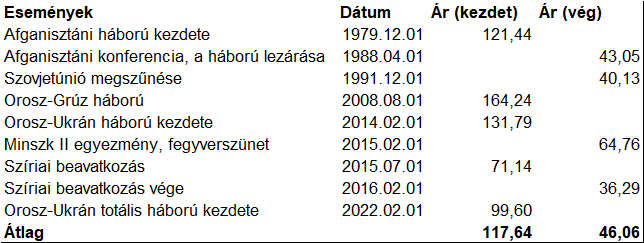 A legjelentősebb háborús események idejét és az akkor érvényes olajárakat (reáláron, tehát jelenlegi dollárban mérve) az alábbi táblázatban is összefoglaltuk: