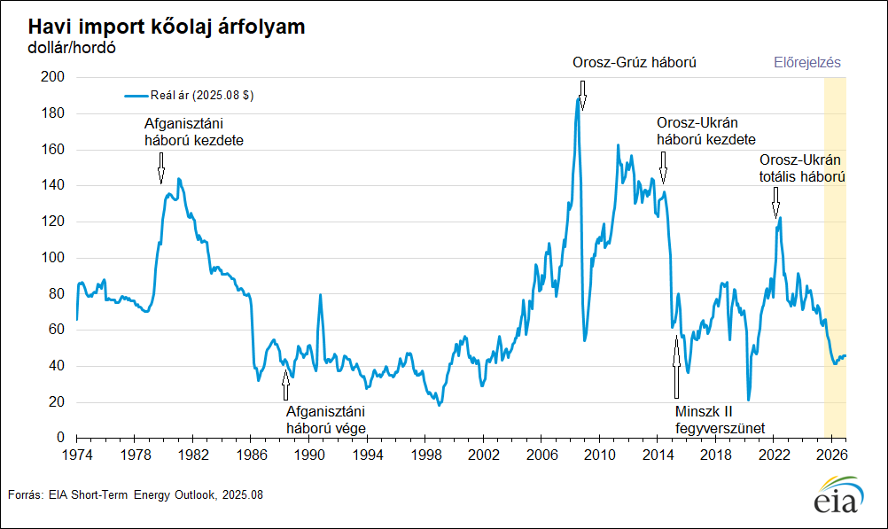 Az olajár esését várja az Amerikai Energiaügyi Minisztérium (EIA) is, akinek a jelenlegi (2025 augusztusi) előrejelző modellje 2026 januárjára várja az ár 50 dollár alá, 2026 márciusára pedig 41 dollárra csökkenését, elsősorban az OPEC+ országok készleteinek 2025-ben várható emelkedése miatt, ami a kitermelés 2025 augusztus elején elhatározott felgyorsításának a következménye.